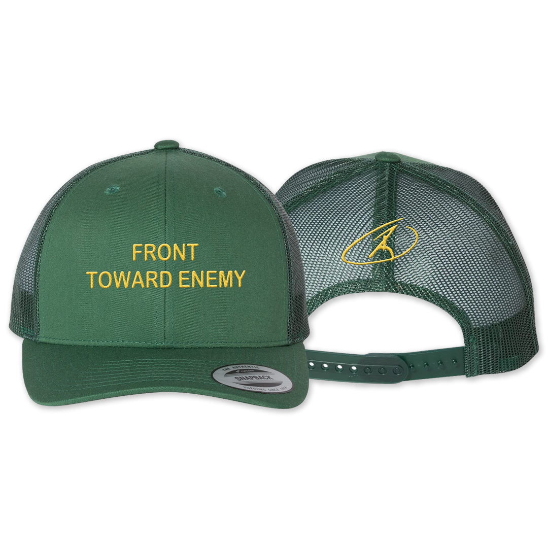 Front Toward Enemy Hat with the following features: 65/35 polyester/cotton Mesh back Structured, mid-profile, six-panel Permacurv visor Snapback closure