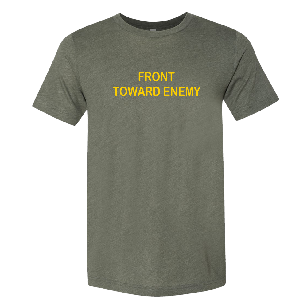 Remind people that direction is key with our “Front Toward Enemy” Shirt. If in doubt, order the next size larger. 50% polyester, 25% combed and ringspun cotton, 25% rayon Size Body Length (in) Body Width (in) S 28 18 M 29 20 L 30 22 XL 31 24 2XL 32 26 3XL 33 28