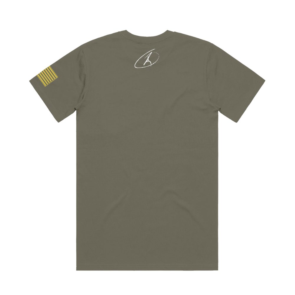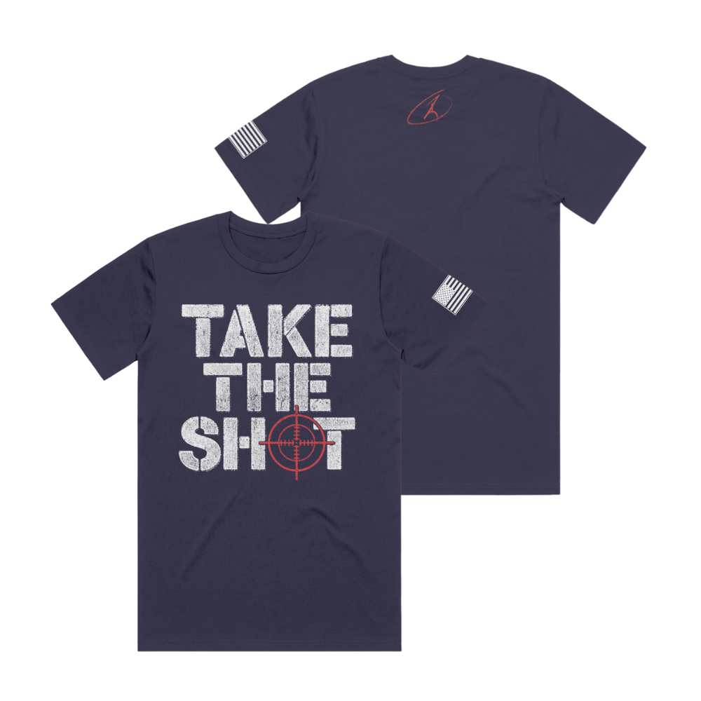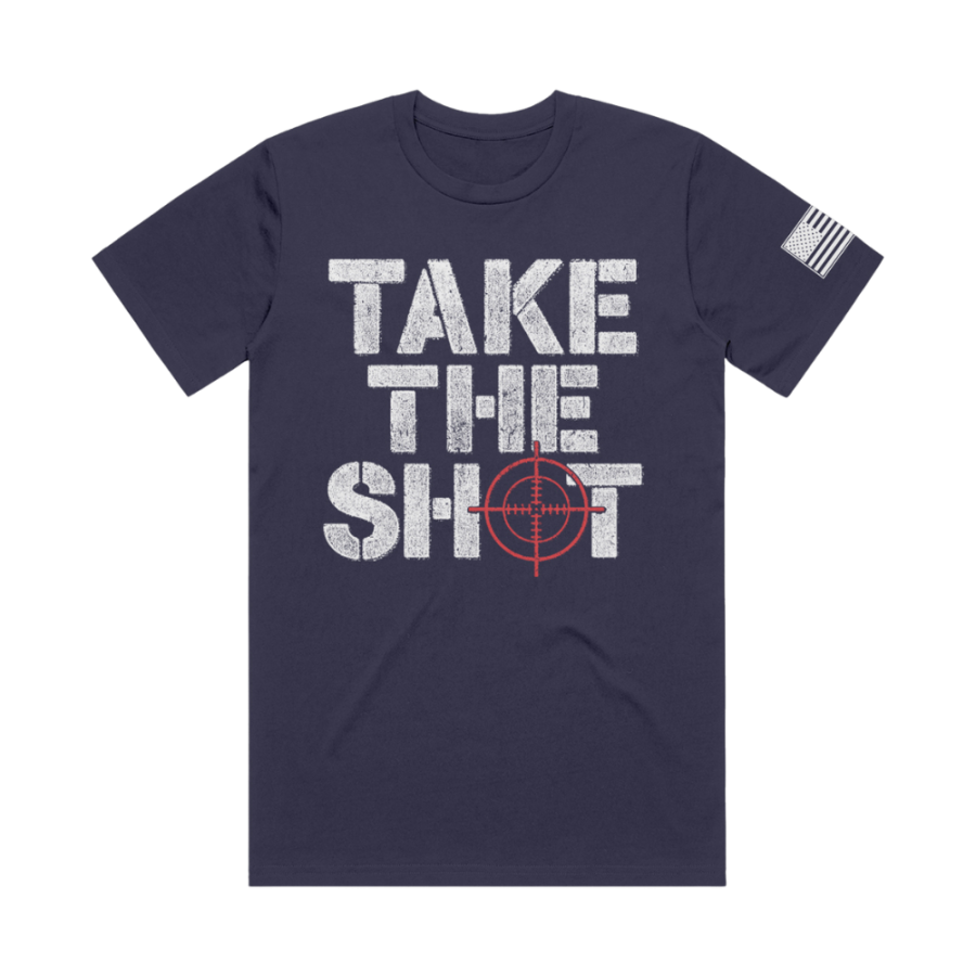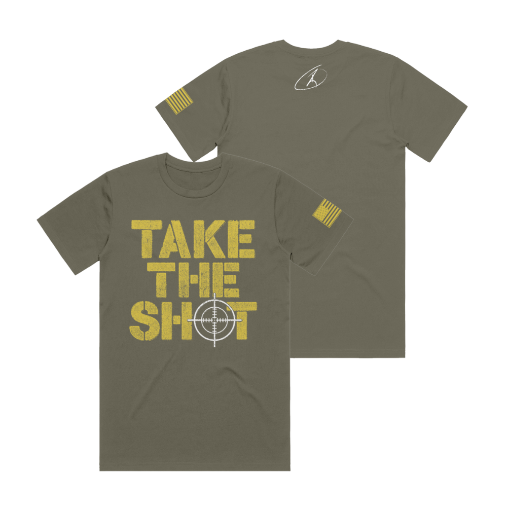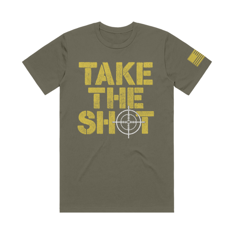 Take The Shot short sleeve with American Flag sleeve print and RJO Apparel on back. Available in khaki green, navy blue, or pitch black! 50% polyester, 25% combed and ringspun cotton, 25% rayon Size Body Length (in) Body Width (in) S 28 18 M 29 20 L 30 22 XL 31 24 2XL 32 26 3XL 33 28